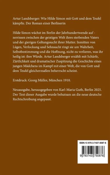Artur Landsberger: Wie Hilde Simon mit Gott und dem Teufel kämpfte. Der Roman einer Berlinerin Hilde Simon wächst im Berlin der Jahrhundertwende auf - zerrissen zwischen der geistigen Welt ihres sterbenden Vaters und der gierigen Geltungssucht ihrer Mutter. Inmitten von Lügen, Verlockung und Sehnsucht ringt sie um Wahrheit, Selbstbestimmung und die Hoffnung, nicht zu verlieren, was ihr heilig ist: ihre Würde. Artur Landsberger erzählt mit Schärfe, Zärtlichkeit und dramatischer Zuspitzung die Geschichte eines jungen Mädchens im Kampf mit einer Welt, die von Gott und dem Teufel gleichermaßen beherrscht scheint. Erstdruck: Georg Müller, München 1910. Neuausgabe, herausgegeben von Karl-Maria Guth, Berlin 2025. Der Text dieser Ausgabe wurde behutsam an die neue deutsche Rechtschreibung angepasst. Gesetzt aus der Minion Pro, 11 pt. Henricus - Edition Deutsche Klassik GmbH