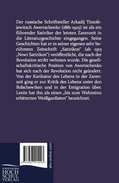 Der russische Schriftsteller Arkadij Timofejewitsch Awertschenko (1881-1925) ist als ein führender Satiriker der letzten Zarenzeit in die Literaturgeschichte eingegangen. Seine Geschichten hat er in seiner eigenen sehr berühmten Zeitschrift Satirikon (ab 1913 Nowi Satirikon ) veröffentlicht, die nach der Revolution strikt verboten wurde. Die gesellschaftskritische Position von Awertschenko hat sich nach der Revolution nicht geändert. Von der Karikatur des Lebens in der Zarenzeit ging er zur Kritik des Lebens unter den Bolschewiken und in der Emigration über. Lenin hat ihn als einen bis zum Wahnsinn erbitterten Weißgardisten bezeichnet.