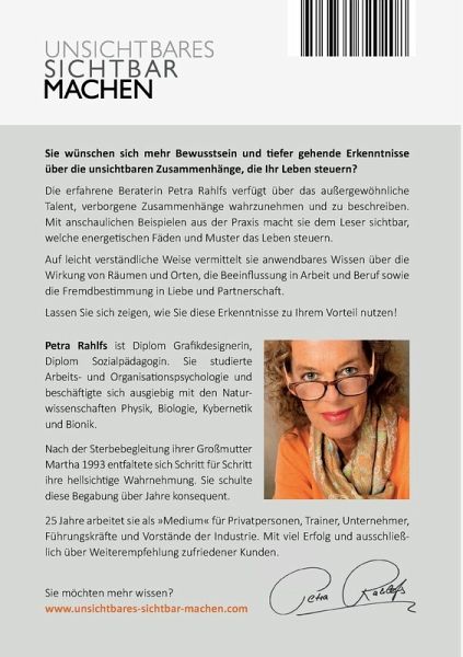 Sie wünschen sich mehr Bewusstsein und tiefer gehende Erkenntnisse über die unsichtbaren Zusammenhänge, die Ihr Leben steuern? Die erfahrene Beraterin Petra Rahlfs verfügt über das außergewöhnliche Talent, verborgene Zusammenhänge wahrzunehmen und zu beschreiben. Mit anschaulichen Beispielen aus der Praxis macht sie dem Leser sichtbar, welche energetischen Fäden und Muster das Leben steuern. Auf leicht verständliche Weise vermittelt sie anwendbares Wissen über die Wirkung von Räumen und Orten, die Beeinflussung in Arbeit und Beruf sowie die Fremdbestimmung in Liebe und Partnerschaft.Lassen Sie sich zeigen, wie Sie diese Erkenntnisse zu Ihrem Vorteil nutzen!