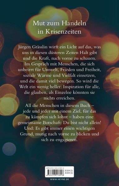 Jürgen Grässlin wirft ein Licht auf das, was uns in diesen düsteren Zeiten Halt gibt und den Mut, nach vorne zu schauen. Im Gespräch mit Menschen wie Margot Käßmann, Gerhard Trabert und Vandana Shiva, die sich unbeirrt für Umwelt, Frieden und Freiheit, soziale Wärme und Vielfalt einsetzen, und die damit viel bewegen, wird die Welt ein wenig heller: Inspiration für alle, die glauben, als Einzelne könnten sie nichts erreichen - die Mutlosigkeit weicht Zuversicht. All die Menschen in diesem Buch - jeden Alters, jeden Geschlechts und jede und jeder mit einem Ziel, für das zu kämpfen sich lohnt - haben eine gemeinsame Botschaft: Du bist nicht allein! Und: Es gibt immer einen Grund, mit Hoffnung nach vorne zu blicken.