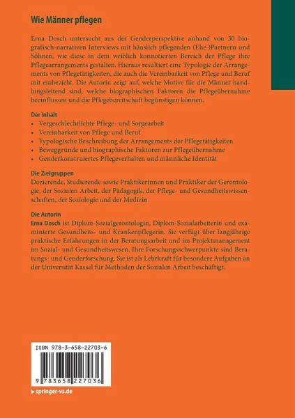 Erna Dosch untersucht aus der Genderperspektive anhand von 30 biografisch-narrativen Interviews mit häuslich pflegenden (Ehe-)Partnern und Söhnen, wie diese in dem weiblich konnotierten Bereich der Pflege ihre Pflegearrangements gestalten. Hieraus resultiert eine Typologie der Arrangements von Pflegetätigkeiten, die auch die Vereinbarkeit von Pflege und Beruf mit einbezieht. Die Autorin zeigt auf, welche Motive für die Männer handlungsleitend sind, welche biographischen Faktoren die Pflegeübernahme beeinflussen und die Pflegebereitschaft begünstigen können.