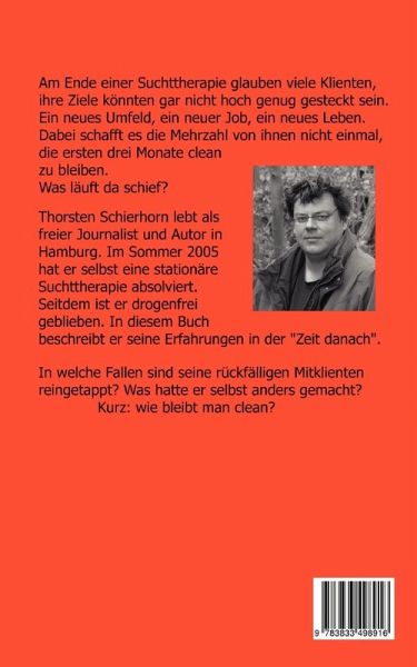 Am Ende einer Suchttherapie glauben viele Klienten, ihre Ziele könnten gar nicht hoch genug gesteckt sein. Ein neues Umfeld, ein neuer Job, ein neues Leben. Dabei schafft es die Mehrzahl von ihnen nicht einmal, die ersten drei Monate clean zu bleiben. Was läuft da schief?Thorsten Schierhorn lebt als freier Journalist und Autor in Hamburg. Im Sommer 2005 hat er selbst eine stationäre Suchttherapie absolviert. Seitdem ist er drogenfrei geblieben. In diesem Buch beschreibt er seine Erfahrungen in der "Zeit danach". In welche Fallen sind seine rückfälligen Mitklienten reingetappt? Was hatte er selbst anders gemacht? Kurz: wie bleibt man clean?