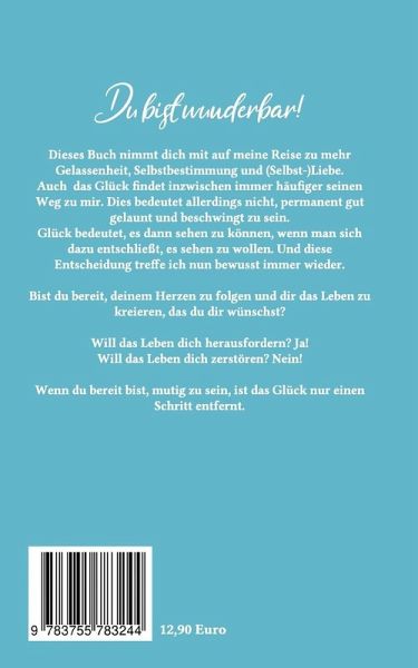 Dieser philosophische und spirituelle Ratgeber nimmt dich mit auf meine Reise zu mehr Gelassenheit, Selbstbestimmung und (Selbst-)Liebe. Auch das Glück findet inzwischen immer häufiger seinen Weg zu mir. Dies bedeutet allerdings nicht, permanent gut gelaunt und beschwingt zu sein. Glück bedeutet, es dann sehen zu können, wenn man sich dazu entschließt, es sehen zu wollen. Und diese Entscheidung treffe ich nun bewusst immer wieder.Bist du bereit, deinem Herzen zu folgen und dir das Leben zu kreieren, das du dir wünschst?Will das Leben dich herausfordern? Ja! Will das Leben dich zerstören? Nein! Wenn du bereit bist, mutig zu sein, ist das Glück nur einen Schritt entfernt.