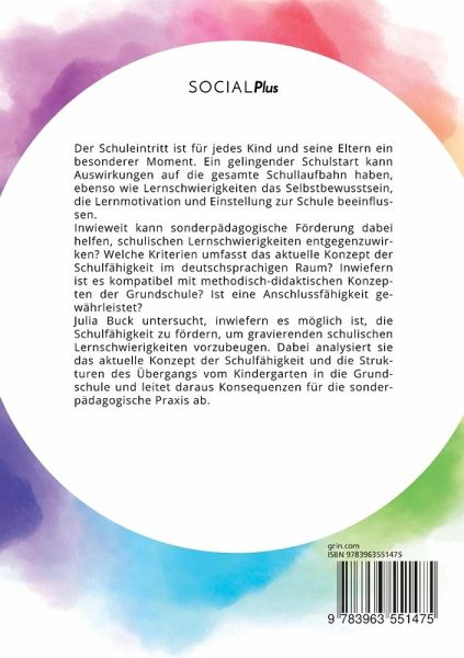 Der Schuleintritt ist für jedes Kind und seine Eltern ein besonderer Moment. Ein gelingender Schulstart kann Auswirkungen auf die gesamte Schullaufbahn haben, ebenso wie Lernschwierigkeiten das Selbstbewusstsein, die Lernmotivation und Einstellung zur Schule beeinflussen. Inwieweit kann sonderpädagogische Förderung dabei helfen, schulischen Lernschwierigkeiten entgegenzuwirken? Welche Kriterien umfasst das aktuelle Konzept der Schulfähigkeit im deutschsprachigen Raum? Inwiefern ist es kompatibel mit methodisch-didaktischen Konzepten der Grundschule? Ist eine Anschlussfähigkeit gewährleistet?Julia Buck untersucht, inwiefern es möglich ist, die Schulfähigkeit zu fördern, um gravierenden schulischen Lernschwierigkeiten vorzubeugen. Dabei analysiert sie das aktuelle Konzept der Schulfähigkeit und die Strukturen des Übergangs vom Kindergarten in die Grundschule und leitet daraus Konsequenzen für die sonderpädagogische Praxis ab. Aus dem Inhalt:-Sonderpädagogik;-Schulfähigkeit;-Schulreife;-Anschlussfähigkeit;-Lernförderung;-Förderschwerpunkt Lernen;-Kindergarten;-Grundschule