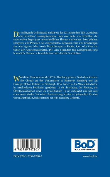 Der vorliegende Gedichtband enthält wie das 2011 unter dem Titel "Ansichten und Einsichten" herausgekommene Buch eine Reihe von Gedichten, die einen weiten Bogen ganz unterschiedlicher Themen umspannen. Dazu gehören Ereignisse und Personen der Zeitgeschichte, Gedanken zum und Erfahrungen aus dem eigenen Leben sowie Betrachtungen zu Politik, Sport oder über das Gebiet der Naturwissenschaften. Die Verse behandeln teils nachdenkliche und besinnliche Themen, teils auch heitere oder skurrile Geschichten.