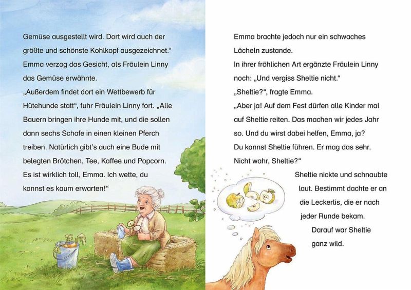 Sheltie ist ein entzückendes Pony, das sich auch durch seine Klugheit auszeichnet und sich vor allem mit Emma bestens versteht. Die Charaktere sind mir persönlich etwas zu oberflächlich geblieben, dennoch glaube ich, dass Kinder Emma lieben werden. Dagegen ist der Nachbar sehr unsympathisch dargestellt, so wie er Sheltie dauernd verdächtigt. Das wiederholt sich leider ein paar Mal, bevor der Diebstahl der Kohlköpfe aufgeklärt wird. Hier fehlt mir ein bisschen Pep in der Erzählung. Am Ende wird es jedoch wieder spannender.
