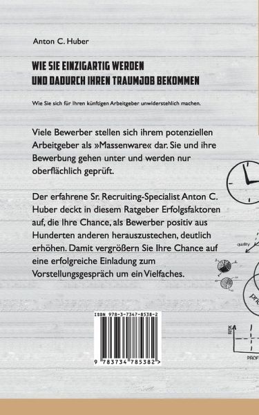 Viele Bewerber stellen sich ihrem potenziellen Arbeitgeber als "Massenware" dar. Sie und ihre Bewerbung gehen unter und werden nur oberflächlich geprüft.Der erfahrene Sr. Recruiting-Specialist Anton C. Huber deckt in diesem Ratgeber Erfolgsfaktoren auf, die Ihre Chance, als Bewerber positiv aus Hunderten anderen herauszustechen, deutlich erhöhen. Damit vergrössern Sie Ihre Chance auf eine erfolgreiche Einladung zum Vorstellungsgespräch um ein Vielfaches.