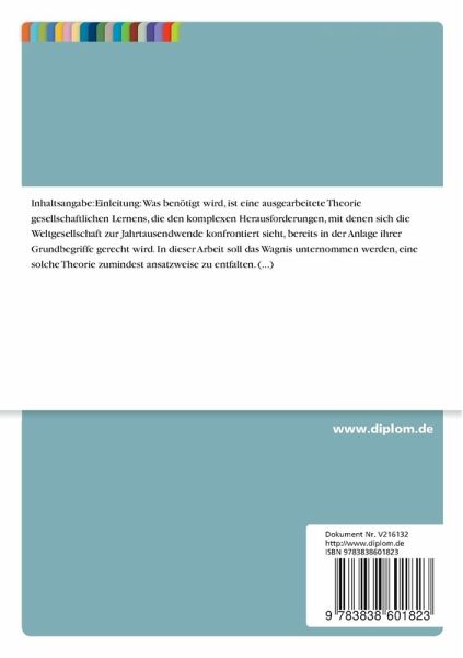 Inhaltsangabe:Einleitung: Was benötigt wird, ist eine ausgearbeitete Theorie gesellschaftlichen Lernens, die den komplexen Herausforderungen, mit denen sich die Weltgesellschaft zur Jahrtausendwende konfrontiert sieht, bereits in der Anlage ihrer Grundbegriffe gerecht wird. In dieser Arbeit soll das Wagnis unternommen werden, eine solche Theorie zumindest ansatzweise zu entfalten. Gang der Untersuchung: Im einführenden zweiten Kapitel werden die bekannten lerntheoretischen Ansätze aus Psychologie und Soziologie in ihren Hauptmerkmalen vorgestellt und einer "radikalsoziologischen" Kritik unterworfen, die es nahelegt, den Speicher der Lemleistung nicht im Individuum, sondern in den sozialen Systemen selbst zu lokalisieren. Der theoretischen Ansatz, der uns dieses Vorgehen erlaubt, die Theorie sozialer Systeme, wird in seinen Grundzügen im dritten Kapitel präsentiert. Wer vom Lernen handelt, muß ein normativ fundiertes Kriterium angeben können, mittels dessen sich das Lernen von bloßer Veränderung unterscheiden läßt. Zu diesem Zweck rekonstruieren wir im vierten Kapitel Luhmanns neuere Rationalitätskonzeption, die in Auseinandersetzung mit einschlägigen philosophischen und sozialwissenschaftlichen Ansätzen hergeleitet wird. Im fünften Kapitel, das im Zentrum der Arbeit steht, wird der Begriff des "sozialsystemischen Lemens" als solcher in seinen vielfältigen Implikationen entfaltet. Dabei geht es unter anderem um die Differenz von Evolution und Lernen, unterschiedliche Lerntypen und um Mechanismen des Lernens. Der praxisbezogenen Konkretisierung ist das sechste Kapitel gewidmet, in dem das entwickelte Lernmodell auf personenorientierte und organisierte Sozialsysteme sowie das Gesellschaftssystern als solches bezogen wird. Die 'Schlußbetrachtung' gewährt einen Ausblick. Inhaltsverzeichnis:Inhaltsverzeichnis: Vorwort3 I.Einleitung4 II.Zur lernsoziologischen Ausgangslage7 II.1.Individuumszentrierte Ansätze8 II.2.intersubjektivitätstheoretische Ansätze12 II.3.Desiderate einer "radikalsoziologischen" Lerntheorie21 III.Grundzüge der Systemtheorie im Hinblick auf ihre lernsoziologische Eignung25 III.1.Die Theorie sozialer Systeme im interdisziplinären Kontext25 III.2.Systemtheorie als universalistische Supertheorie30 III.3.Systemtheorie und Kritische Theorie38 IV.Rationalität als Lernkriterium.46 IV.1.Vernunft und Rationalität46 IV.2.Sozialwissenschaftliche Rationalitätskonzeptionen49 IV.3.Basale Selbstreferenz, Reflexivität und [¿]