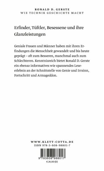 Geniale Frauen und Männer haben mit ihren Erfindungen die Menschheit gewandelt und bis heute geprägt - oft zum Besseren, manchmal auch zum Schlechteren. Kenntnisreich bietet Roland D. Gerste ein ebenso informatives wie spannendes Leseerlebnis an der Schnittstelle von Genie und Irrsinn, Fortschritt und Armageddon.