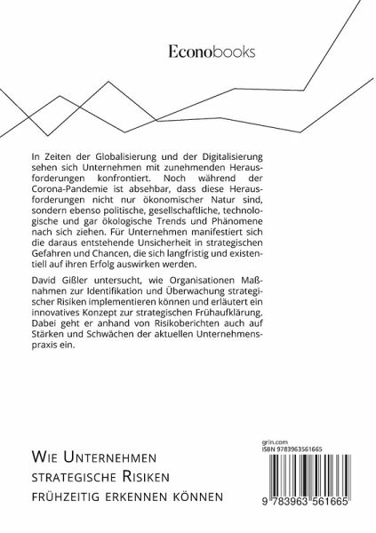 In Zeiten der Globalisierung und der Digitalisierung sehen sich Unternehmen mit zunehmenden Herausforderungen konfrontiert. Noch während der Corona-Pandemie ist absehbar, dass diese Herausforderungen nicht nur ökonomischer Natur sind, sondern ebenso politische, gesellschaftliche, technologische und gar ökologische Trends und Phänomene nach sich ziehen. Für Unternehmen manifestiert sich die daraus entstehende Unsicherheit in strategischen Gefahren und Chancen, die sich langfristig und existentiell auf ihren Erfolg auswirken werden. David Gißler untersucht, wie Organisationen Maßnahmen zur Identifikation und Überwachung strategischer Risiken implementieren können und erläutert ein innovatives Konzept zur strategischen Frühaufklärung. Dabei geht er anhand von Risikoberichten auch auf Stärken und Schwächen der aktuellen Unternehmenspraxis ein. Aus dem Inhalt: - Risikomanagement; - retrograde und progressive Risikoidentifikation; - Szenarioanalyse; - Risk Governance; - Strategie-Alignment; - Risikoradar