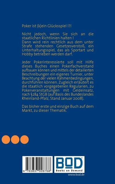 Poker ist (k)ein Glücksspiel !?! Nicht jedoch, wenn Sie sich an die staatlichen Richtlinien halten !Dann wird rein rechtlich aus dem unter Strafe stehenden Gesetzesverstoß, ein Unterhaltungsspiel, das als Sportart und Hobby betrieben werden darf.Jeder Pokerinteressierte soll mit Hilfe dieses Buches einen Pokerfachverstand aufbauen können und mittels der detailierten Beschreibungen ein eigenes Turnier, unter Beachtung der vielen Rahmenbedingungen, durchführen können. Zugleich erläutert es die staatlich vorgegebenen Regularien, zu Pokerveranstaltungen mit Geldeinsatz, nach §284 StGB (auf Basis des Bundeslandes Rheinland-Pfalz, Stand Januar 2008). Das bisher erste und einzige Buch auf dem Markt, zu dieser Thematik.