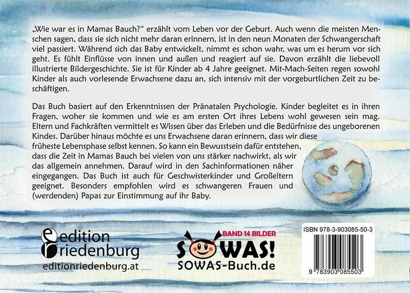 "Wie war es in Mamas Bauch?" erzählt vom Leben vor der Geburt. Auch wenn die meisten Menschen sagen, dass sie sich nicht mehr daran erinnern, ist in den neun Monaten der Schwangerschaft viel passiert. Während sich das Baby entwickelt, nimmt es schon wahr, was um es herum vor sich geht. Es fühlt Einflüsse von innen und außen und reagiert auf sie. Davon erzählt die liebevoll illustrierte Bildergeschichte. Sie ist für Kinder ab 4 Jahre geeignet. Mit-Mach-Seiten regen sowohl Kinder als auch vorlesende Erwachsene dazu an, sich intensiv mit der vorgeburtlichen Zeit zu beschäftigen. Das Buch basiert auf den Erkenntnissen der Pränatalen Psychologie. Kinder begleitet es in ihren Fragen, woher sie kommen und wie es am ersten Ort ihres Lebens wohl gewesen sein mag. Eltern und Fachkräften vermittelt es Wissen über das Erleben und die Bedürfnisse des ungeborenen Kindes. Darüber hinaus möchte es uns Erwachsene daran erinnern, dass wir diese früheste Lebensphase selbst kennen. So kann ein Bewusstsein dafür entstehen, dass die Zeit in Mamas Bauch bei vielen von uns stärker nachwirkt, als wir das allgemein annehmen. Darauf wird in den Sachinformationen näher eingegangen. Das Buch ist auch für Geschwisterkinder und Großeltern geeignet. Besonders empfohlen wird es schwangeren Frauen und (werdenden) Papas zur Einstimmung auf ihr Baby.___ Reihe SOWAS! BILDER Band 14 ___ Alle SOWAS!-Titel unter www.sowas-buch.deSOWAS! macht Kinder zu Experten für sich selbst.Ein Buch vom Verlag edition riedenburg (www.editionriedenburg.at)