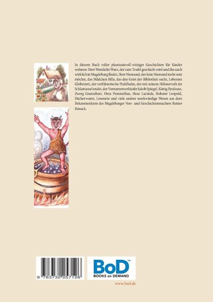 In diesem Buch voller phantasievoll-witziger Geschichten für Kinder wohnen: Herr Wendelin Wurz, der zum Teufel geschickt wird und ihn auch wirklich in Magdeburg findet, Herr Niemand, der kein Niemand mehr sein möchte, das Mädchen Billa, das den Geist der Bibliothek sucht, Lobesam Globetrott, der verführerische Prahlhahn, der mit seinem Hühnervolk im Schlamassel endet, der Vornamenverkäufer Jakob Spiegel, König Heulsuse, Zwerg Gnatzebart, Oma Pemmelhus, Hexe Lucinde, Roboter Leopold, Bücherwurm, Leseratte und viele andere merkwürdige Wesen aus dem Bekanntenkreis des Magdeburger Vers- und Geschichtenmachers Reiner Bonack.