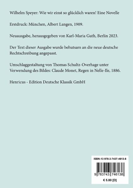 Wilhelm Speyer: Wie wir einst so glücklich waren! Eine NovelleErstdruck: München, Albert Langen, 1909.Neuausgabe, herausgegeben von Karl-Maria Guth, Berlin 2023.Der Text dieser Ausgabe wurde behutsam an die neue deutsche Rechtschreibung angepasst.Umschlagabbildung: Claude Monet, Regen in Nelle-Ile, 1886Gesetzt aus der Minion Pro, 11 pt.Die Sammlung Hofenberg erscheint im Verlag Henricus - Edition Deutsche Klassik GmbH, Berlin