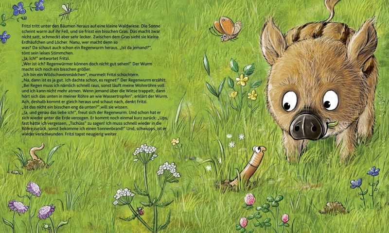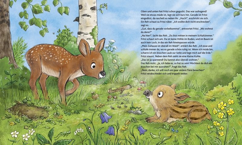 Wie wohnen eigentlich die anderen Waldtiere, fragt sich Wildschweinmädchen Fritzi. Ihre Mama erklärt ihr, dass jedes Tier seinen ganz eigenen Platz im Wald hat. Das möchte Fritzi selbst sehen. Das kleine Wildschwein tapst in ein spannendes Abenteuer und entdeckt dabei das Zuhause von Reh, Fuchs, Eule und vielen anderen Tieren im Wald.