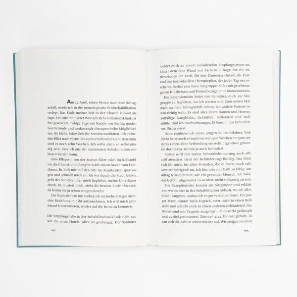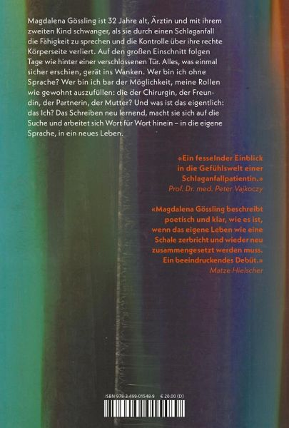 Magdalena Gössling ist 32 Jahre alt und mit ihrem zweiten Kind schwanger, als sie durch einen Schlaganfall die Fähigkeit zu sprechen und die Kontrolle über ihre rechte Körperseite verliert. Auf den großen Einschnitt folgen Tage wie hinter einer verschlossenen Tür. Alles, was einmal sicher erschien, gerät ins Wanken. Wer bin ich ohne Sprache? Wer bin ich bar der Möglichkeit, meine Rollen wie gewohnt auszufüllen: die der Chirurgin, der Freundin, der Partnerin, der Mutter? Und wer ist das eigentlich: ich? Schreibend die eigene Sprache erforschend, macht sich die Autorin auf die Suche. Magdalena Gössling erzählt in diesem berührenden Text, was geschieht, wenn ein einschneidendes Ereignis das Leben in ein Davor und Danach teilt, und wie man nach tiefgreifenden körperlichen und geistigen Verlusten die eigene Identität Stück für Stück neu zusammensetzt.