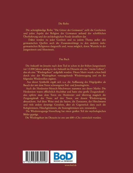 Die ReiheDie achtzigbändige Reihe "Die Götter der Germanen" stellt die Gottheiten und jeden Aspekt der Religion der Germanen anhand der schriftlichen Überlieferung und der archäologischen Funde detailliert dar.Dabei werden zu jeder Gottheit und zu jedem Thema außer den germanischen Quellen auch die Zusammenhänge zu den anderen indogermanischen Religionen dargestellt und, wenn möglich, deren Wurzeln in der Jungsteinzeit und Altsteinzeit.Das BuchDie Ankunft im Jenseits nach dem Tod ist schon in der frühen Jungsteinzeit vor 12.000 Jahren analog zu der Ankunft im Diesseits als eine "zweite Geburt", also als eine "Wiedergeburt" aufgefaßt worden. Dieses Motiv wurde schon bald durch eine der Wiedergeburt vorausgehende Wiederzeugung und ein ihr folgendes Wiederstillen ergänzt.Aus dieser Symbolik ergab sich u.a. die Auffassung des Hügelgrabes als Bauch der mit dem Toten schwangeren Erd- und Jenseitsgöttin.Auch die Herdentier-Mensch-Mischwesen stammen aus dieser Mythe: Die Herdentiere waren offsichtlich fruchtbar und hatte eine große Zeugunskraft - also opferte man dem Toten ein Herdentier und übertrug magisch dessen Zeugungskraft auf den Toten, um dessen Wiederzeugung abzusichern. Auf diese Weise sind die Satyrn, die Zentrauren, der Hirschmann und viele andere derartige Gestalten, aber als Gegenstück dazu auch die Kuhgöttinnen, Hirschgöttinnen, die Stutengöttinnen usw. entstanden.Die Wiederzeugungs-Vorstellung hat einen großen Teil der mythologischen Bilder geprägt.Die Wiedergeburt im Diesseits ist erst um 600 v.Chr. entwickelt worden.