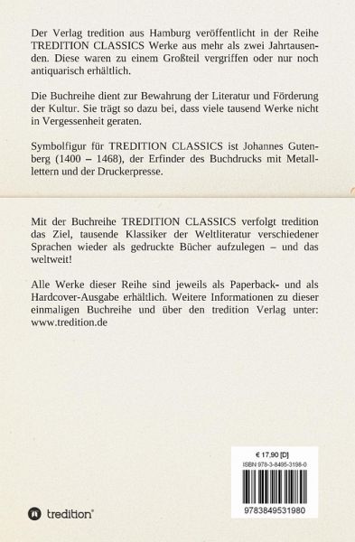 Dieses Werk ist Teil der Buchreihe TREDITION CLASSICS. Der Verlag tredition aus Hamburg veröffentlicht in der Buchreihe TREDITION CLASSICS Werke aus mehr als zwei Jahrtausenden. Diese waren zu einem Großteil vergriffen oder nur noch antiquarisch erhältlich. Mit der Buchreihe TREDITION CLASSICS verfolgt tredition das Ziel, tausende Klassiker der Weltliteratur verschiedener Sprachen wieder als gedruckte Bücher zu verlegen und das weltweit! Die Buchreihe dient zur Bewahrung der Literatur und Förderung der Kultur. Sie trägt so dazu bei, dass viele tausend Werke nicht in Vergessenheit geraten.