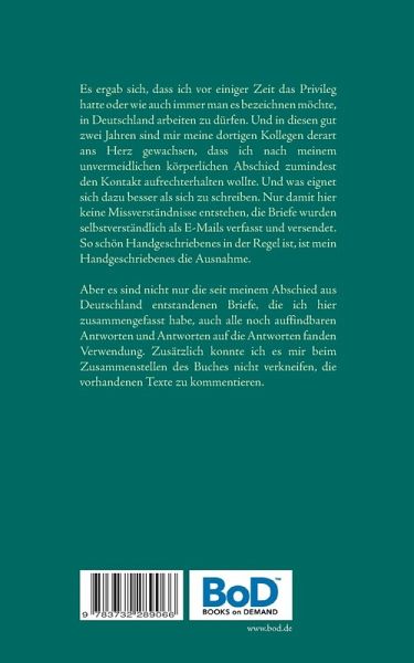 Es ergab sich, dass ich vor einiger Zeit das Privileg hatte, oder wie auch immer man es bezeichnen möchte, in Deutschland arbeiten zu dürfen. Und in diesen gut zwei Jahren sind mir meine dortigen Kollegen derart ans Herz gewachsen, dass ich nach meinem unvermeidlichen körperlichen Abschied zumindest den Kontakt aufrechterhalten wollte. Und was eignet sich dazu besser als sich zu schreiben. Nur damit hier keine Missverständnisse entstehen, die Briefe wurden selbstverständlich als E-Mails verfasst und versendet. So schön Handgeschriebenes in der Regel ist, ist mein Handgeschriebenes die Ausnahme.Aber es sind nicht nur die seit meinem Abschied aus Deutschland entstandenen Briefe, die ich hier zusammengefasst habe, auch alle noch auffindbaren Antworten und Antworten auf die Antworten fanden Verwendung. Zusätzlich konnte ich es mir beim Zusammenstellen des Buches nicht verkneifen, die vorhandenen Texte zu kommentieren.
