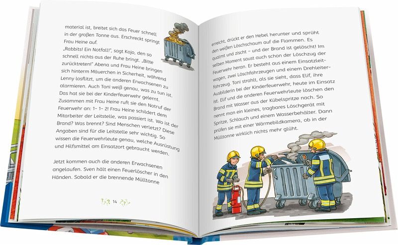 Hier ist mächtig was los: Die Kinder Toni, Abena, Kojo und Lenny sind hautnah dabei, wenn die Feuerwehr eine brennende Mülltonne löscht, Tonis Katze aus einem Baum rettet und ein Hornissennest umsiedelt. Als Hobby-Detektive stellen die Kinder ihren Spürsinn unter Beweis und helfen bei einer Suchaktion der Polizei. Auch im Fußballstadion und am Badesee schauen sie mutigen Einsatzkräften über die Schulter. Jede der 15 abgeschlossenen Geschichten bietet kleine Häppchen Sachwissen.