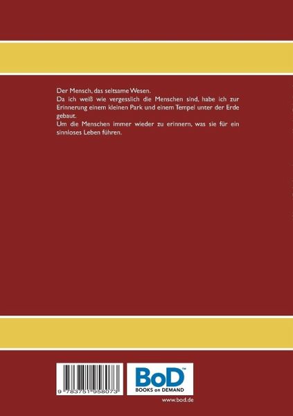 Der Mensch, das seltsame Wesen.Da ich weiß wie vergesslich die Menschen sind, habe ich zur Erinnerung einem kleinen Park und einem Tempel unter der Erde gebaut.Um die Menschen immer wieder zu erinnern, was sie für ein sinnloses Leben führen.