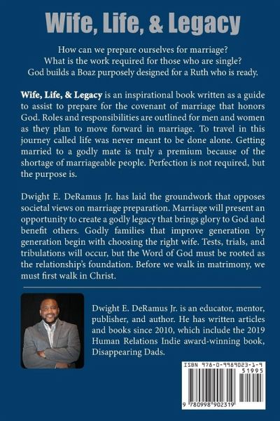 How can we prepare ourselves for marriage? What is the work required for those who are single? God builds a Boaz purposely designed for a Ruth who is ready. Wife, Life, and Legacy is an inspirational book written as a guide to assist to prepare for the covenant of marriage that honors God. Roles and responsibilities are outlined for men and women as they plan to move forward in marriage. To travel on this journey called life was never meant to be done alone. Getting married to a godly mate is truly a premium because of the shortage of marriageable people. Perfection is not required, but the purpose is. Dwight E. DeRamus Jr. has laid the groundwork that opposes societal views on marriage preparation. Marriage will present an opportunity to create a godly legacy that brings glory to God and benefits others. Godly families that improve generation by generation begin with choosing the right wife. Tests, trials, and tribulations will occur, but the word of God must be rooted as the relationship's foundation. Before we walk in matrimony, we must first walk in Christ.