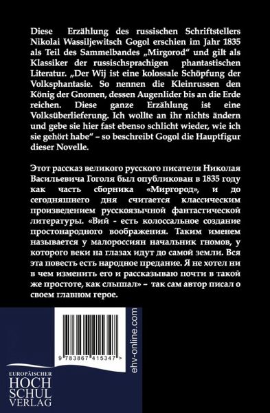 "Diese Erzählung des russischen Schriftstellers Nikolai Wassiljewitsch Gogol erschien im Jahr 1835 als Teil des Sammelbandes "Mirgorod" und gilt als Klassiker der russischsprachigen phantastischen Literatur. Der Wij ist eine kolossale Schöpfung der Volksphantasie. So nennen die Kleinrussen den König der Gnomen, dessen Augenlider bis an die Erde reichen. 'Diese ganze Erzählung ist eine Volksüberlieferung. Ich wollte an ihr nichts ändern und gebe sie hier fast ebenso schlicht wieder, wie ich sie gehört habe' - so beschreibt Gogol die Hauptfigur dieser Novelle.