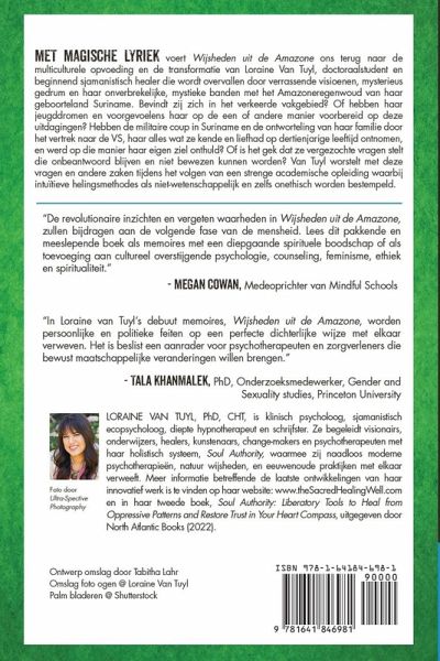 MET MAGISCHE LYRIEK voert Wijsheden uit de Amazone ons terug naar de multiculturele opvoeding en de transformatie van Loraine van Tuyl, doctoraalstudent en beginnend sjamanistisch healer die wordt overvallen door verrassende visioenen, mysterieus gedrum en haar onverbrekelijke, mystieke banden met het Amazoneregenwoud van haar geboorteland Suriname. Bevindt zij zich in het verkeerde vakgebied? Of hebben haar jeugddromen en voorgevoelens haar op de een of andere manier voorbereid op deze uitdagingen? Hebben de militaire coup in Suriname en de ontworteling van haar familie door het vertrek naar de VS, haar alles wat ze kende en liefhad op dertienjarige leeftijd ontnomen, en werd op die manier haar eigen ziel onthuld? Of is het gek dat ze vergezochte vragen stelt die onbeantwoord blijven en niet bewezen kunnen worden? Van Tuyl worstelt met deze vragen en andere zaken tijdens het volgen van een strenge academische opleiding waarbij intuïtieve helingsmethodes als niet-wetenschappelijk en zelfs onethisch worden bestempeld. Review 2017 USA Best Book Awards Finalist in Multicultural Non-Fiction 2017 USA Best Book Awards Finalist in Health: Psychology/Mental Illness 2017 USA Best Book Awards Finalist in Best Cover Design: Non-Fiction "De revolutionaire inzichten en vergeten waarheden in Wijsheden uit de Amazone, zullen bijdragen aan de volgende fase van de mensheid. Lees dit pakkende en meeslepende boek als memoires met een diepgaande spirituele boodschap of als toevoeging aan cultureel overstijgende psychologie, counseling, feminisme, ethiek en spiritualiteit." ~Megan Cowan, medeoprichter van Mindful Schools "In Loraine van Tuyl's debuut memoires, Wijsheden uit de Amazone, worden persoonlijke en politieke feiten op een perfecte dichterlijke wijze met elkaar verweven. Het is beslist een aanrader voor psychotherapeuten en zorgverleners die bewust maatschappelijke veranderingen willen brengen." ~Tala Khanmalek, PhD, Onderzoeksmedewerker, Gender and Sexuality studies, Princeton University "Een betoverend en inzichtelijk geheel van wijsheden en compassie . . . Ten zeerste aanbevolen!" ~Mark Plotkin, PhD, schrijver van The Amazon en Tales of a Shaman's Apprentice "Loraine's inspirerende reis voert ons mee van de jungles van Suriname naar de Verenigde Staten en Europa, terwijl zij worstelt met een wereld die meer waarde hecht aan wat kan worden gezien en gemeten, dan aan de waarheid in haar hart en haar verleden. Haar proces waarin zij zich probeert te ontdoen van het conventionele denken en haar verwachtingen voor de schoonheid, eenvoud en waarheid van de eeuwenoude inheemse wijsheden, dient als gids voor een wereld die het contact met haar innerlijke waarheid is kwijtgeraakt." ~Jennifer B. Monahan, Sjamaan en schrijfster van This Trip Will Change Your Life: A Shaman's Story of Spirit Evolution