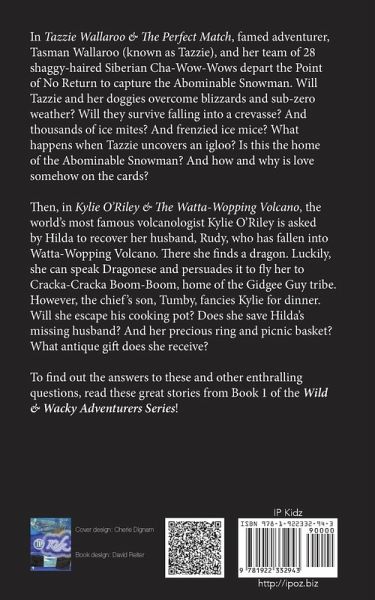 TWO Adventurous Stories in one... TAZZIE WALLAROO & THE PERFECT MATCH The wildest and toughest adventurers in this world - and the next - have failed to find and capture the Abominable Snowman. Famed adventurer, Tasman Wallaroo (known as Tazzie) enters the scene, saying she will 'crush that cruel creep to crumbs!' Training hard until she is as trim and taut as Superwoman after a super make-over, she and her team of 28 shaggy-haired Siberian Cha-Wow-Wows depart the Point of No Return. Will Tazzie and her doggies overcome blizzards and sub-zero weather? Will they survive falling into a crevasse? And thousands of ice mites? And frenzied ice mice? Will they overcome frostbite? And starvation? What happens when Tazzie uncovers an igloo? Is this the home of the Abominable Snowman? And how and why is love somehow on the cards? KYLIE O'RILEY AND THE WATTA-WOPPING VOLCANO The world's most famous volcanologist Kylie O'Riley is asked by Hilda to recover her husband, Rudy, who has fallen into an active volcano, along with her precious ring and picnic basket. Kylie, who is fearless, brave, and extremely gifted, promises to recover Hilda's treasures. Off she heads to where the mighty Watta-Wopping Volcano is located. There she finds a dragon. Luckily, she can speak Dragonese and is able to persuade it to fly her to Cracka-Cracka Boom-Boom, home of the Gidgee Guy tribe. However, the chief's son, Tumby, fancies Kylie for dinner. Will she escape his cooking pot? What about the dangerous exploding Boom-Boom HaHa volcano? Does she find and recover Hilda's missing husband? What about the precious ring and picnic basket? What antique gift does she receive? To find out the answers to these and other enthralling questions, read these great books!
