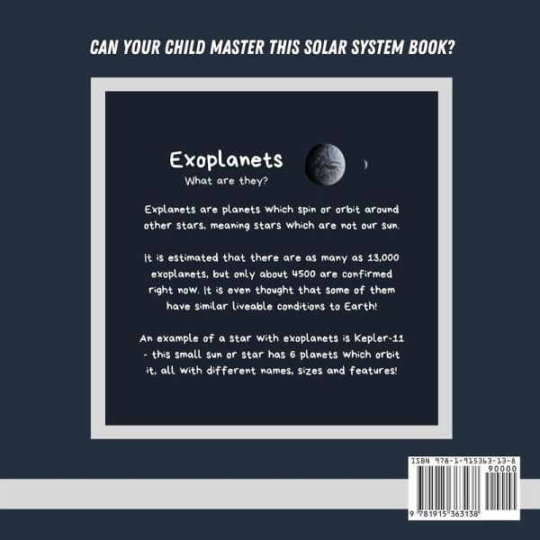 A fun space & planets fact & activity book for intrigued kids! Can your child master the solar system? Filled with many different facts & questions to test your child's knowledge like:Can you believe that Jupiter has 79 different moons! Did you know the Earth is so small it could fit into the sun 1.3 million times? Which burning gas causes a star to shine? Why Pluto was declassified as a planet in 2006.. This awesome & educational book has more than 15 questions & answers to test their knowledge, as well as pages upon pages of unbelievable solar system facts! No matter whether your child is brand new to the solar system, or whether they are just hungry for more knowledge, this book is designed for them to prosper, so.. Buy this wonderful fact book now!