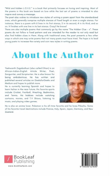 """Wild and hidden L.O.V.E." is a book that primarily focuses on loving and inspiring. Most of the poems in this book are based on love while the last set of poems is intended to also inspire and convey a message. The poet also wishes to introduce new styles of writing a poem apart from the standardized ones, which generally comprise multiple stanzas of fixed length or even a single stanza. For instance, there is a poem with 6 lines in its first stanza, 5 in its second, 4 in its third, and so on. It finishes with one line in its last stanza. Crazy! He knows! There are also multiple poems that commonly go by the name "The Hidden Clue - x". These poems do not follow a fixed pattern and are intended for the reader to not only read but also find hidden clues in them. Along with traditional ones, the poet presents a few other ways in which one may write poems that not many poets must have tried. The hope is to lead young poets to increase the variety and coin new styles in writing poems.""