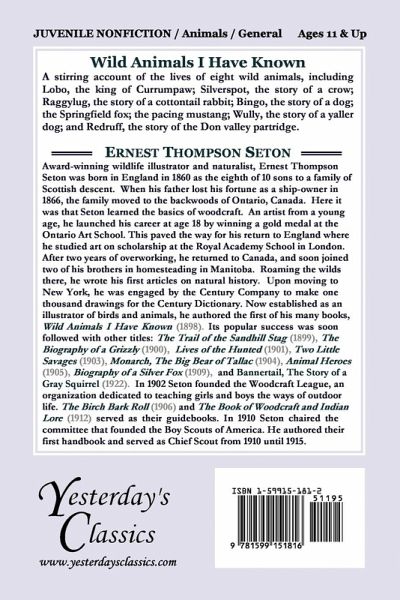 A stirring account of the lives of eight wild animals, including Lobo, the king of Currumpaw; Silverspot, the story of a crow; Raggylug, the story of a cottontail rabbit; Bingo, the story of a dog; the Springfield fox; the pacing mustang; Wully, the story of a yaller dog; and Redruff, the story of the Don valley partridge.
