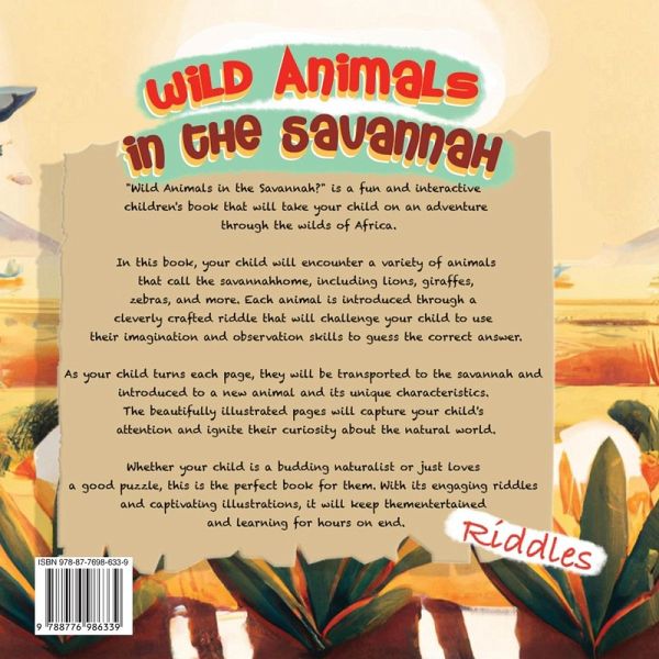 "Wild Animals in the Savannah Riddles and Coloring Book" is a captivating children's book that takes young readers on an imaginative journey into the vibrant world of the African savannah. Filled with intriguing riddles and enchanting coloring pages, this non-fictional book introduces children to the wonders of the savannah ecosystem and its diverse animal inhabitants. As children turn each page, they are greeted by a beautifully illustrated coloring page featuring a different animal from the savannah. From the regal lions to the graceful giraffes, from the speedy cheetahs to the playful meerkats, a variety of captivating creatures are showcased throughout the book. Each coloring page is thoughtfully designed, allowing children to unleash their creativity and bring the animals to life with their own unique color choices. Accompanying each animal illustration is a fun and challenging riddle that encourages children to engage in critical thinking and problem-solving. The riddles are cleverly crafted to provide clues about the featured animal, inspiring children to observe the animal's characteristics, behaviors, and habitat. By unraveling the riddles, young readers embark on an exciting quest to discover the hidden secrets of the savannah. "Wild Animals in the Savannah Riddles and Coloring Book" goes beyond the riddles and coloring pages, offering additional educational content. Informative descriptions accompany each animal, providing fascinating facts about their lives in the wild. Children will learn about the animals' physical features, unique adaptations, social structures, and their role within the savannah ecosystem. These educational snippets enhance children's understanding of the animal kingdom while fostering a sense of curiosity and appreciation for the natural world. With its combination of riddles, coloring pages, and educational content, "TWild Animals in the Savannah Riddles and Coloring Book" provides an immersive and enriching reading experience for children. It stimulates their creativity, encourages problem-solving skills, and ignites a passion for learning about wildlife and nature. This delightful book is sure to captivate young minds and become a treasured addition to any child's library.