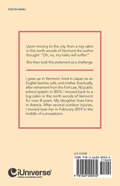 Upon moving to the city, from a log cabin in the north woods of Vermont the author thought: "Oh, no, my haiku will suffer!" She then took this statement as a challenge.