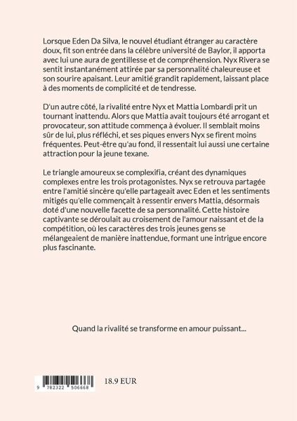 Lorsque Eden Da Silva, le nouvel étudiant étranger au caractère doux, fit son entrée dans la célèbre université de Baylor, il apporta avec lui une aura de gentillesse et de compréhension. Nyx Rivera se sentit instantanément attirée par sa personnalité chaleureuse et son sourire apaisant. Leur amitié grandit rapidement, laissant place à des moments de complicité et de tendresse.D'un autre côté, la rivalité entre Nyx et Mattia Lombardi prit un tournant inattendu. Alors que Mattia avait toujours été arrogant et provocateur, son attitude commença à évoluer. Il semblait moins sûr de lui, plus réfléchi, et ses piques envers Nyx se firent moins fréquentes. Peut-être qu'au fond, il ressentait lui aussi une certaine attraction pour la jeune texane.Le triangle amoureux se complexifia, créant des dynamiques complexes entre les trois protagonistes. Nyx se retrouva partagée entre l'amitié sincère qu'elle partageait avec Eden et les sentiments mitigés qu'elle commençait à ressentir envers Mattia, désormais doté d'une nouvelle facette de sa personnalité. Cette histoire captivante se déroulait au croisement de l'amour naissant et de la compétition, où les caractères des trois jeunes gens se mélangeaient de manière inattendue, formant une intrigue encore plus fascinante.