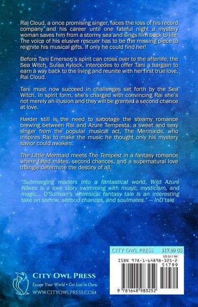 Rai Cloud, a once promising singer, faces the loss of his record company and his career until one fateful night... A mystery woman saves him from a stormy sea and sings him back to life. The voice of his elusive rescuer has to be the missing piece to reignite his musical gifts. If only he could find her! Before Tani Emerson’s spirit can cross over to the afterlife, the Sea Witch, Sulaa Kylock, intercedes to offer Tani a bargain to earn a way back to the living and reunite with her first true love, Rai Cloud. Tani must now succeed in challenges set forth by the Sea Witch. In spirit form, she’s charged with convincing Rai she’s not merely an illusion and they will be granted a second chance at love. Harder still is the need to sabotage the steamy romance brewing between Rai and Azure Tempesta, a sweet and sexy singer from the popular musical act, The Mermaids, who inspires Rai to make the music he thought only his mystery savior could awaken. The Little Mermaid meets The Tempest in a fantasy romance where fated mates, second chances, and a supernatural love triangle determine the destiny of all.