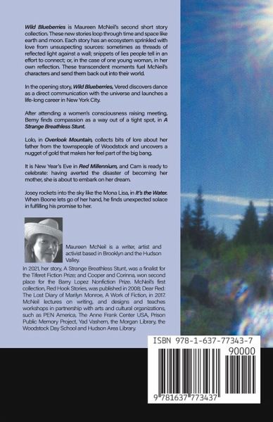 Wild Blueberries is Maureen McNeil's second short story collection. These new stories loop through time and space like earth and moon. Each story has an ecosystem sprinkled with love from unsuspecting sources: sometimes as threads of reflected light against a wall; snippets of lies people tell in an effort to connect; or, in the case of one young woman, in her own reflection. These transcendent moments fuel McNeil's characters and send them back out into their world. In the opening story, Wild Blueberries, Vered discovers dance as a direct communication with the universe and launches a life-long career in New York City. After attending a women's consciousness raising meeting, Bemy finds compassion as a way out of a tight spot, in A Strange Breathless Stunt. Lolo, in Overlook Mountain, collects bits of lore about her father from the townspeople of Woodstock and uncovers a nugget of gold that makes her feel part of the big bang. It is New Year's Eve in Red Millennium, and Cam is ready to celebrate: having averted the disaster of becoming her mother, she is about to embark on her dream. Josey rockets into the sky like the Mona Lisa, in It's the Water. When Boone lets go of her hand, he finds unexpected solace in fulfilling his promise to her.