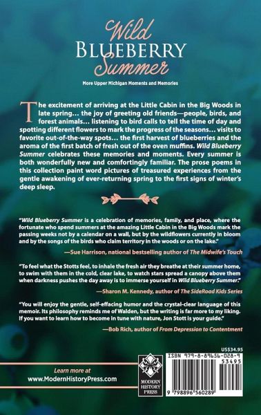 The excitement of arriving at the Little Cabin in the Big Woods in late spring... the joy of greeting old friends-people, birds, and forest animals... listening to bird calls to tell the time of day and spotting different flowers to mark the progress of the seasons... visits to favorite out-of-the-way spots... the first harvest of blueberries and the aroma of the first batch of fresh out of the oven muffins. Wild Blueberry Summer celebrates these memories and moments. Every summer is both wonderfully new and comfortingly familiar. The prose poems in this collection paint word pictures of treasured experiences from the gentle awakening of ever-returning spring to the first signs of winter's deep sleep. "Wild Blueberry Summer is a celebration of memories, family, and place, where the fortunate who spend summers at the amazing Little Cabin in the Big Woods mark the passing weeks not by a calendar on a wall, but by the wildflowers currently in bloom and by the songs of the birds who claim territory in the woods or on the lake." - Sue Harrison, national bestselling author of The Midwife's Touch "To feel what the Stotts feel, to inhale the fresh air they breathe at their summer home, to swim with them in the cold, clear lake, to watch stars spread a canopy above them when darkness pushes the day away is to immerse yourself in Wild Blueberry Summer." - Sharon M. Kennedy, author of The SideRoad Kids Series "You will enjoy the gentle, self-effacing humor and the crystal-clear language of this memoir. Its philosophy reminds me of Walden, but the writing is far more to my liking. If you want to learn how to become in tune with nature, Jon Stott is your guide." - Bob Rich, author of From Depression to Contentment From Modern History Press