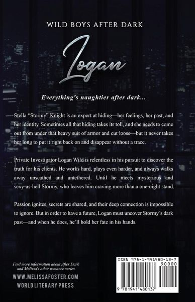 Discover the magic of New York Times bestseller Melissa Foster's writing, and see why millions of readers have fallen in love with the Love in Bloom series Wild Billionaires After Dark are a series of stand-alone romances that may also be enjoyed as part of the larger Love in Bloom series. Indulge your inner vixen with these sexy billionaires! Meet the Wild Boys... Four fiercely loyal, sinfully sexy, uber alpha brothers, about to fall head over heels for their leading ladies.Meet the Bad Boys... Four fiercely loyal, sinfully sexy, uber alpha brothers, about to fall head over heels for their leading ladies. Everything's naughtier after dark... Stella "Stormy" Knight is an expert at hiding--her feelings, her past, and her identity. Sometimes all that hiding takes its toll, and she needs to come out from under that heavy suit of armor and cut loose--but it never takes her long to put it right back on and disappear without a trace. Navy SEAL turned private Investigator Logan Wild is relentless in his pursuit to discover the truth for his clients. He works hard, plays even harder, and always walks away unscathed and untethered. Until he meets mysterious and sexy-as-hell Stormy, who leaves him craving more than a one-night stand. Passion ignites, secrets are shared, and their deep connection is impossible to ignore. But in order to have a future, Logan must uncover Stormy's dark past--and when he does, he'll hold her fate in his hands. *** The Wild Billionaires After Dark books are long enough to burn up the sheets and short enough to leave you craving more. The Billionaires After Dark are available for your binge-reading pleasure. WILD BOYS AFTER DARK Logan Heath Jackson Cooper BAD BOYS AFTER DARK Mick Dylan Carson Brett The BILLIONAIRES AFTER DARK series are part of the LOVE IN BLOOM big family romance collection. Each book may be read as a stand-alone novel, or as part of the series.