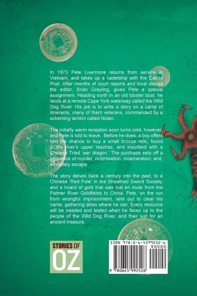 In 1973 Pete Livermore returns from service in Vietnam, and lands a cadetship with the Cairns Post. After months of court reports and sports articles the editor, Brian Grayling, gives Pete a special assignment. Heading north by boat, he lands at a remote Cape York waterway called the Wild Dog River. His job is to write a story on a camp of itinerants, many of them veterans, commanded by a scheming larrikin called Nolan. The initially warm reception soon turns cold, however, and Pete is told to leave. Before he does, a boy offers him the chance to buy a small bronze relic, found in the river's upper reaches, and inscribed with a Chinese triad 'war dragon.' The purchase sets off a sequence of murder, victimisation, incarceration, and ultimately escape. The story delves back a century into the past, to a Chinese 'Red Pole' in the Sheathed Sword Society, and a hoard of gold that was lost en route from the Palmer River Goldfields to China. Pete, on the run from wrongful imprisonment, sets out to clear his name, gathering allies where he can. Every resource will be needed and tested when he faces up to the people of the Wild Dog River, and their lust for a lost treasure.