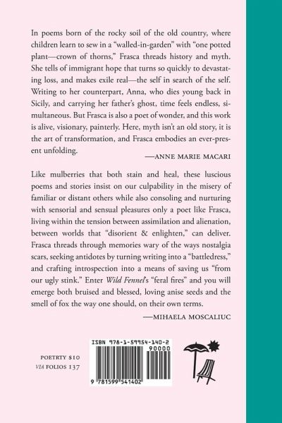 Poetry. Italian Studies. In poems born of the rocky soil of the old country, where children learn to sew in a 'walled-in-garden' with 'one potted plant--crown of thorns, ' Frasca threads history and myth. She tells of immigrant hope that turns so quickly to devastating loss, and makes exile real--the self in search of the self. Writing to her counterpart, Anna, who dies young back in Sicily, and carrying her father's ghost, time feels endless, simultaneous. But Frasca is also a poet of wonder, and this work is alive, visionary, painterly. Here, myth isn't an old story, it is the art of transformation, and Frasca embodies an ever-present unfolding.--Anne Marie Macari Like mulberries that both stain and heal, these luscious poems and stories insist on our culpability in the misery of familiar or distant others while also consoling and nurturing with sensorial and sensual pleasures only a poet like Frasca, living within the tension between assimilation and alienation, between worlds that 'disorient & enlighten, ' can deliver. Frasca threads through memories wary of the ways nostalgia scars, seeking antidotes by turning writing into a 'battledress, ' and crafting introspection into a means of saving us 'from our ugly stink.' Enter WILD FENNEL's 'feral fires' and you will emerge both bruised and blessed, loving anise seeds and the smell of fox the way one should, on their own terms.--Mihaela Moscaliuc