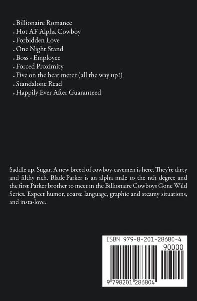 I had no idea who that cowboy was, I swear. How was I supposed to know that gorgeous man was billionaire Blade Parker? We were in an airport bar in the middle of nowhere, for crying out loud… I didn't even know I liked cowboys until he locked those crystal blue eyes on me from under his Stetson. Last night was the first and only time I ever-got in the saddle with a stranger. I don't know what came over me. Well, actually I do. Oops. Lord help me. If I'd known he was a client there is NO WAY last night would've happened. Now I have to work with the Parkers on one of the biggest land deals in Montana history. I'm the only attorney in my office who specializes in real estate. To top it off, I'm staying on the Parker's ranch in a trailer parked right next to his. I Can. Not. get sidetracked, no matter how hot af he is. My career is on the line. Surely, we can keep things professional, can't we? Saddle up, Sugar. A new breed of cowboy-cavemen is here. They're dirty and filthy rich. Blade Parker is an alpha male to the nth degree and the first Parker brother to meet in the Billionaire Cowboys Gone Wild Series. Expect humor, coarse language, graphic and steamy situations, and insta-love. No cheating and a Happily ever after.