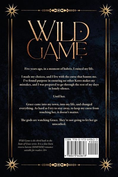 Five years ago, in a moment of hubris, I ruined my life. I made my choices, and I live with the curse that haunts me. I've found purpose in ensuring no other Keres makes my mistakes, and I was prepared to go through the rest of my days in lonely silence. Until her. Grace came into my town, into my life, and changed everything. As hard as I try to stay away, to keep my curse from touching her, it doesn't matter. The gods are watching Grace. They're not going to let her go unscathed. Wild Game is the third book in the State of Grace series. It is a slow burn reverse harem (MMFMM) romance suitable for readers 18+. State of Grace reading order: 1. Run Riot 2. Silver Bullet 3. Wild Game 4. Dare Not 5. Saving Grace