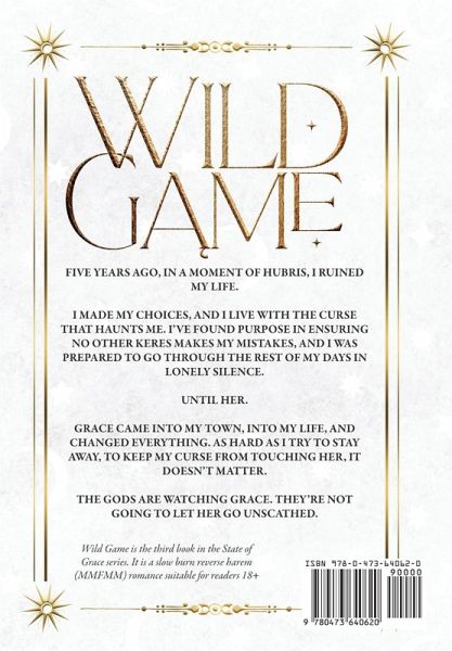Five years ago, in a moment of hubris, I ruined my life. I made my choices, and I live with the curse that haunts me. I've found purpose in ensuring no other Keres makes my mistakes, and I was prepared to go through the rest of my days in lonely silence. Until her. Grace came into my town, into my life, and changed everything. As hard as I try to stay away, to keep my curse from touching her, it doesn't matter. The gods are watching Grace. They're not going to let her go unscathed. Wild Game is the third book in the State of Grace series. It is a slow burn reverse harem (MMFMM) romance suitable for readers 18+