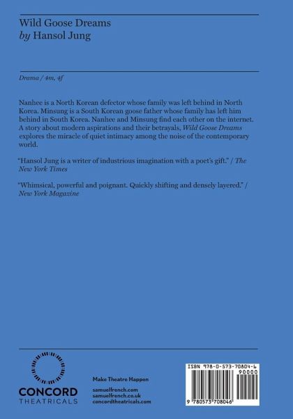 Nanhee is a North Korean defector whose family was left behind in North Korea. Minsung is a South Korean goose father whose family has left him behind in South Korea. Nanhee and Minsung find each other on the internet. A story about modern aspirations and their betrayals, Wild Goose Dreams explores the miracle of quiet intimacy among the noise of the contemporary world.