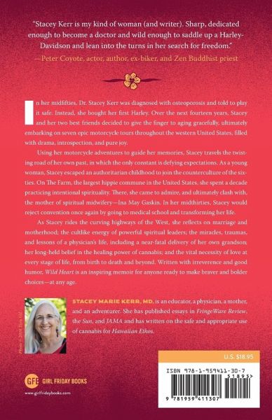For Dr. Stacey Marie Kerr, a road is only worth traveling if it comes with some unexpected turns. In her midfifties, Dr. Stacey Kerr was diagnosed with osteoporosis and told to play it safe. Instead, she bought her first Harley. Over the next fourteen years, Stacey and her two best friends decided to give the finger to aging gracefully, ultimately embarking on seven epic motorcycle tours throughout the western United States filled with drama, introspection, and pure joy. Using her motorcycle adventures to guide her memories, Stacey travels the twisting road of her own past, in which the only constant is defying expectations. As a young woman, Stacey escaped an authoritarian childhood to join the counterculture of the sixties. On The Farm, the largest hippie commune in the United States, she spent a decade practicing intentional spirituality. There, she came to admire, and ultimately clash with, the mother of spiritual midwifery—Ina May Gaskin. In her midthirties, Stacey would reject convention once again by going to medical school and transforming her life. As Stacey rides the curving highways of the West, she reflects on marriage and motherhood; the cultlike energy of powerful spiritual leaders; the miracles, traumas, and lessons of a physician’s life, including a near-fatal delivery of her own grandson; her long-held belief in the healing power of cannabis; and the vital necessity of love at every stage of life, from birth to death and beyond. Written with irreverence and good humor, Wild Heart is an inspiring memoir for anyone ready to make braver and bolder choices—at any age.