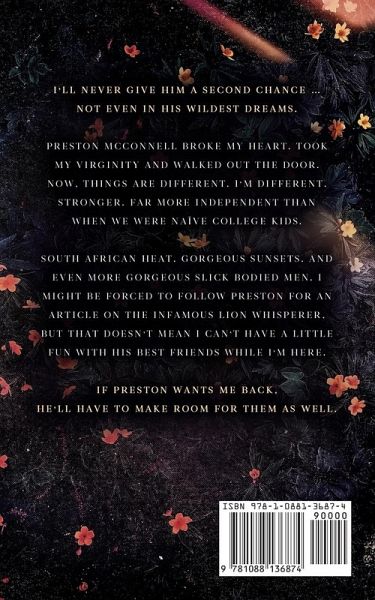 I'll never give him a second chance ... not even in his wildest dreams. Preston McConnell broke my heart. Took my virginity and walked out the door. Now, things are different. I'm different. Stronger. Far more independent than when we were naïve college kids. South African heat. Gorgeous sunsets. And even more gorgeous slick bodied men. I might be forced to follow Preston for an article on the infamous Lion Whisperer, but that doesn't mean I can't have a little fun with his best friends while I'm here. If Preston wants me back, he'll have to make room for them as well.