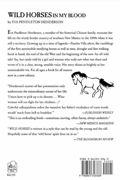 Eva Pendleton Henderson, a member of the historical Chisum family, recounts her life on the windy border country of southern New Mexico in the 1890s when it was still a territory. Growing up in a time of legends--Pancho Villa afoot, the rumblings of the first automobile terrifying horses as well as men, drought and fate walking hand in hand, the end of the old West and the beginning of the new. An oft told tale? Yes, but rarely told by a girl and woman who truly saw what was there and wrote of it in a clear, strong, sensible voice. Her story shines as brightly as her unmistakable wit. For all ages; a book for all seasons now in a new edition.