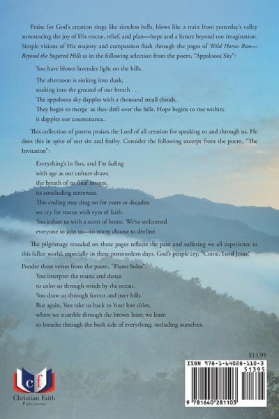 Praise for God’s creation rings like timeless bells, blows like a train from yesterday’s valley announcing the joy of His rescue, relief, and plan—hope and a future beyond our imagination. Simple visions of His majesty and compassion flash through the pages of Wild Horses Run—Beyond the Sugared Hills as in the following selection from the poem, "Appaloosa Sky": You have blown lavender light on the hills. The afternoon is sinking into dusk, soaking into the ground of our breath . . . The appaloosa sky dapples with a thousand small clouds. They begin to merge as they drift over the hills. Hope begins to rise within—it dapples our countenance. This collection of poems praises the Lord of all creation for speaking to and through us. He does this in spite of our sin and frailty. Consider the following excerpt from the poem, "The Invitation": Everything’s in flux, and I’m fading with age as our culture draws the breath of its final images, its concluding sentences. This ending may drag on for years or decades; we cry for rescue with eyes of faith. You infuse us with a scent of home. We’ve welcomed everyone to join us—so many choose to decline. The pilgrimage revealed on these pages reflects the pain and suffering we all experience in this fallen world, especially in these postmodern days. God’s people cry, "Come, Lord Jesus!" The following lines from the poem, "Seabird Passing" praise Him: It’s You, Lord; You absorb A spout of tears as I press into the chest of Your Spirit. You touch me with a breath of Your boundless beauty. Ponder these verses from the poem, "Piano Solos": You interpret the music and dance to color us through winds by the ocean. You draw us through forests and over hills. But again, You take us back to Your lost cities, where we stumble through the brown haze; we learn to breathe through the back side of everything, including ourselves.