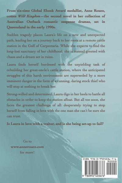 From six-time Global eBook Award medallist, Anne Rouen, comes Wild Kingdom-the second novel in her collection of Australian Outback romantic suspense dramas set in Queensland in the late 1980s and early 1990s. Sudden tragedy places Laura's life on a new and unexpected path, leading her on a journey back to her roots at a remote cattle station in the Gulf of Carpentaria. While she expects to find the long-lost sanctuary of her childhood, she is instead greeted with chaos and a dream set in ruins. Laura finds herself burdened with the unyielding task of rebuilding her great-uncle's cattle station, where the anticipated struggles of this harsh environment are superseded by a more imminent danger in the form of a cunning, daring stock thief who will stop at nothing to break her. Strong-willed and determined, Laura digs in her heels to battle all obstacles in order to keep the station afloat. But all too soon, she faces the greatest challenge of all: desperately trying to stop herself from falling for the one man she can't be sure she can trust. Is Laura in love with a traitor, and is she being set-up to fail?